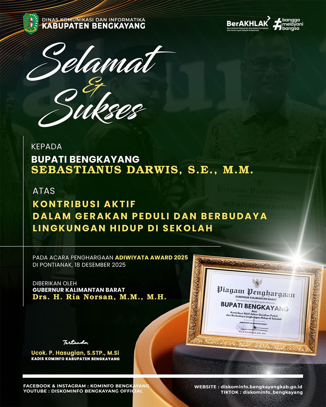Congratulations and best wishes to the Regent of Bengkayang, Sebastianus Darwis, S.E., M.M., for receiving the award for “Kontribusi Aktif dalam Gerakan Peduli dan Berbudaya Lingkungan Hidup di Sekolah (Active Contribution to the School-Based Environmental Awareness and Culture Movement)” at the 2025 Adiwiyata Award Ceremony in Pontianak, December 18, 2025.