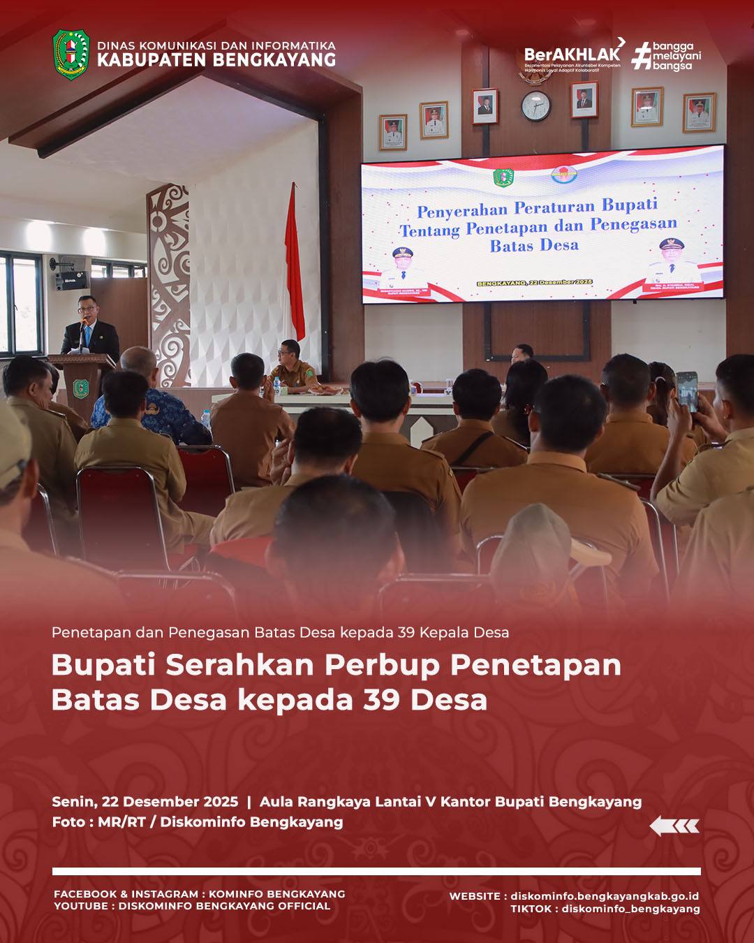 Bengkayang – Bupati Bengkayang, Sebastianus Darwis, secara resmi menyerahkan Peraturan Bupati (Perbup) tentang Penetapan dan Penegasan Batas Desa kepada 39 Kepala Desa. Kegiatan ini dilaksanakan pada Senin, (22/12)/225) di Aula Rangkaya Kantor Bupati.