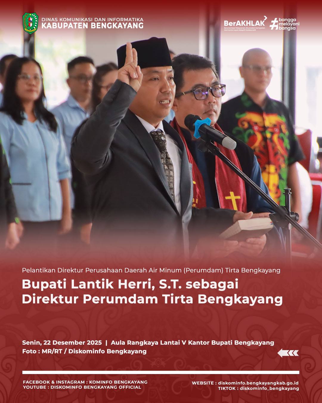 Bengkayang – Bupati Bengkayang, Sebastianus Darwis,S.E.,M.M., secara resmi melantik Herri, S.T. sebagai Direktur Perusahaan Daerah Air Minum (Perumdam) Tirta Bengkayang untuk masa bakti 2025-2029. Pelantikan yang dilaksanakan pada Senin, (22/12/2025) di Aula Rangkaya Kantor Bupati Bengkayang.