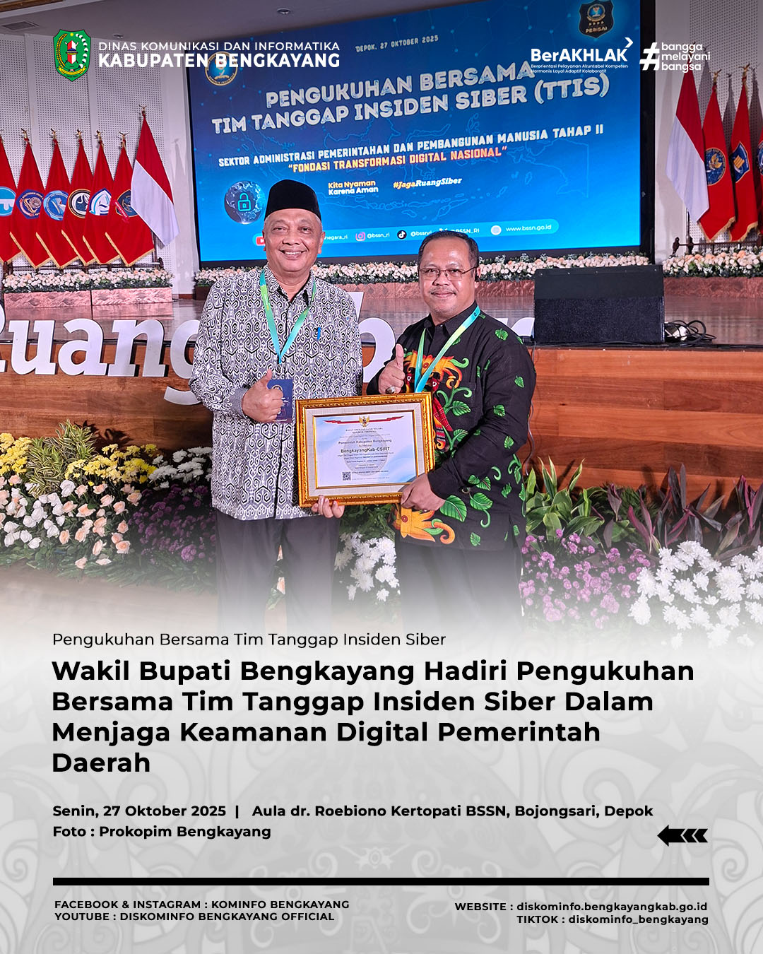 Depok – Wakil Bupati Bengkayang, Drs. H. Syamsul Rizal menghadiri kegiatan Pengukuhan Bersama Tim Tanggap Insiden Siber (TTIS) Sektor Administrasi Pemerintahan dan Pembangunan Manusia Tahap II, Cyber Incident Exchange Forum (CIEF), serta Bimbingan Teknis TTIS, yang digelar di Aula dr. Roebiono Kertopati Badan Siber dan Sandi Negara (BSSN), Bojongsari, Depok, Senin (27/10).