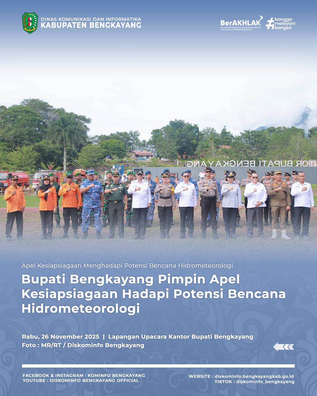Bengkayang – Bupati Bengkayang, Sebastianus Darwis, S.E., M.M., memimpin Apel Kesiapsiagaan Menghadapi Potensi Bencana Hidrometeorologi yang dilaksanakan pada hari Rabu, 26 November 2025, dimulai pukul 08.00 WIB, bertempat di Lapangan Upacara Kantor Bupati Bengkayang, Jl. Guna Baru Bengkayang.