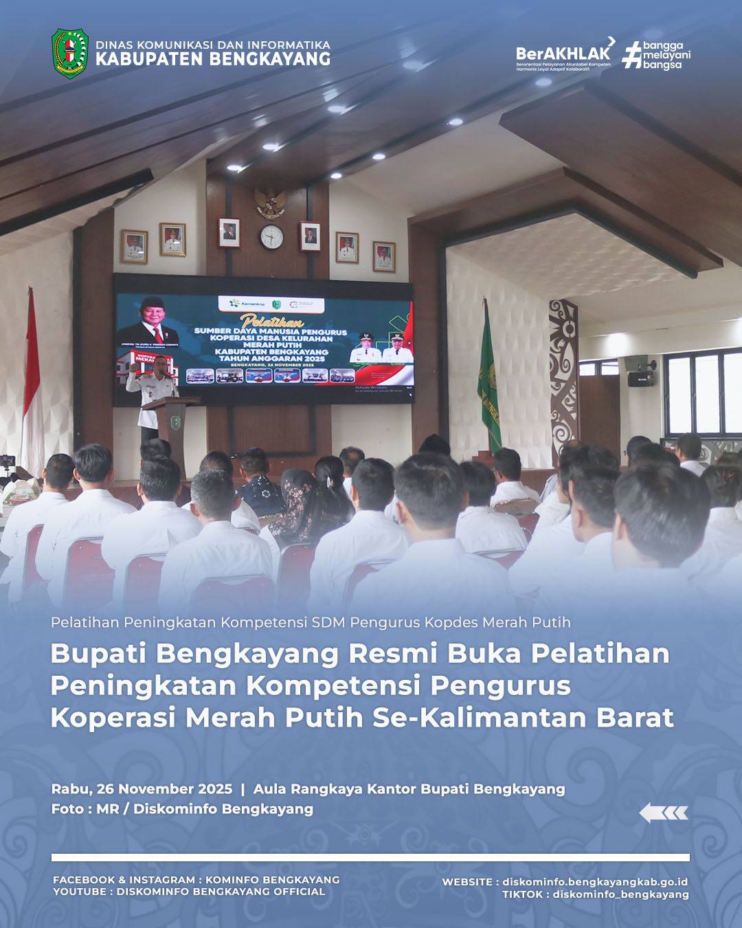Bengkayang – Bupati Bengkayang secara resmi membuka kegiatan Pelatihan Peningkatan Kompetensi Sumber Daya Manusia Pengurus Koperasi Desa/Kelurahan Merah Putih Se–Kalimantan Barat Angkatan II Tahun 2025 yang berlangsung di Aula Rangkaya Kantor Bupati Bengkayang, Rabu (26/11/2025).