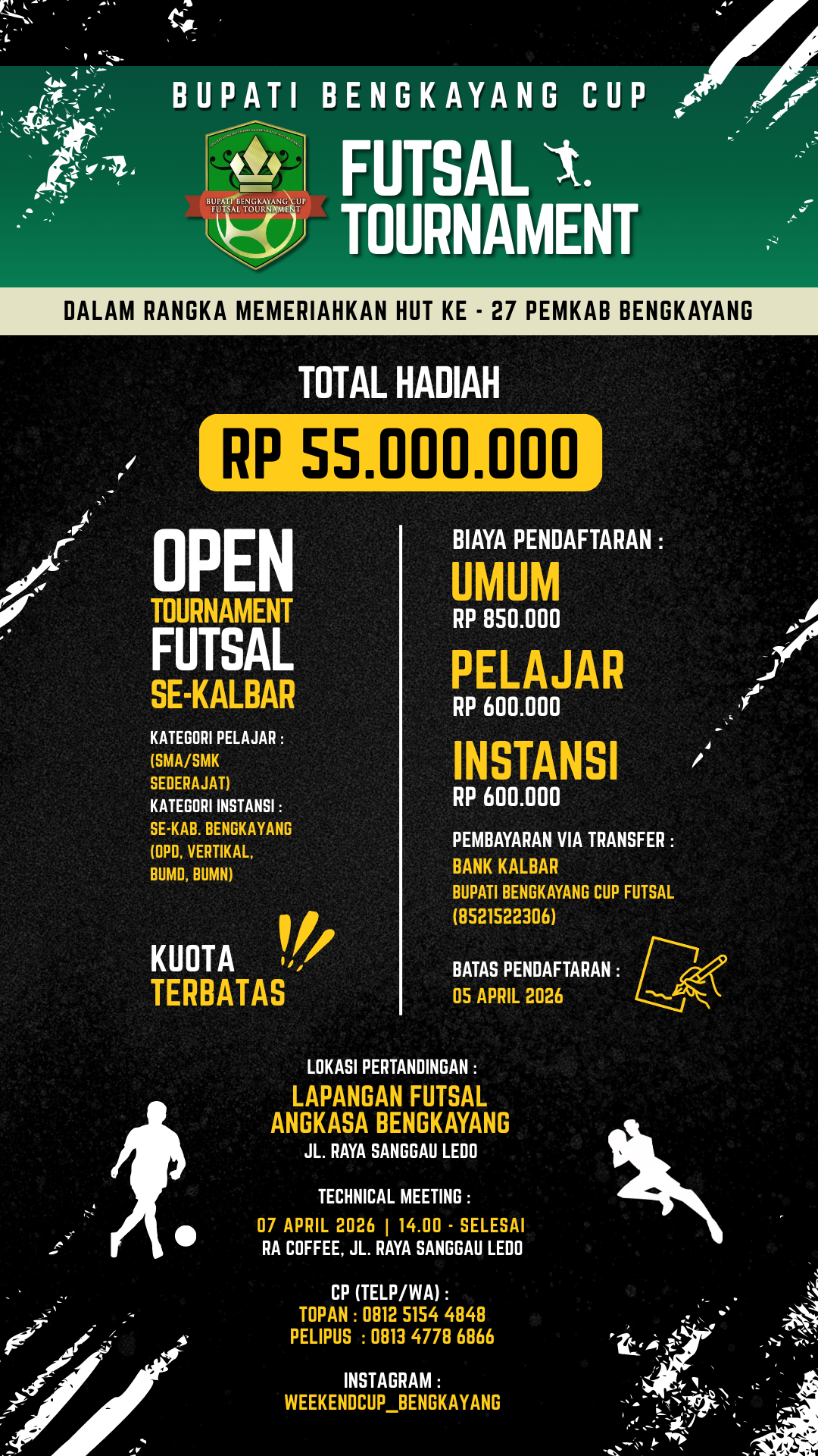 Let’s join and enliven the Bengkayang Regent Cup Futsal Tournament 2026, held in celebration of the 27th Anniversary of the Bengkayang Regency Government.