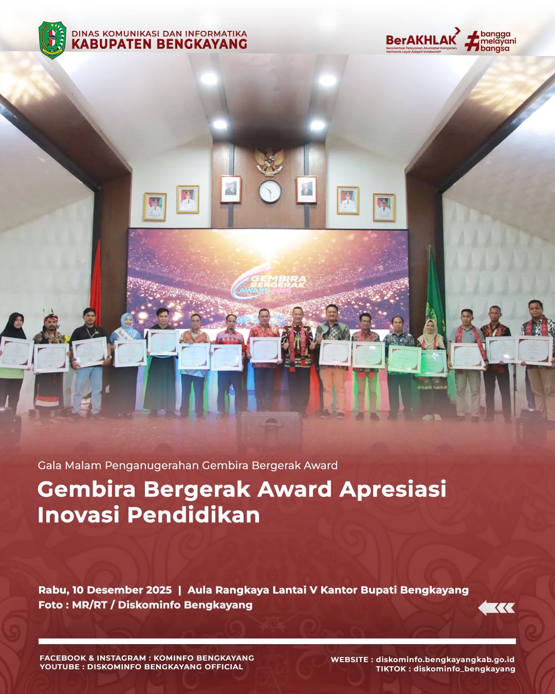 Bengkayang – Pemerintah Kabupaten Bengkayang kembali menyelenggarakan Gala Malam Penganugerahan Gembira Bergerak Award Tahun 2025, Rabu (10/12/2025). Acara yang digelar di Aula Rangkaya V Kantor Bupati ini bertujuan memberikan apresiasi tertinggi atas dedikasi dan kontribusi luar biasa para insan pendidikan dan budaya.
