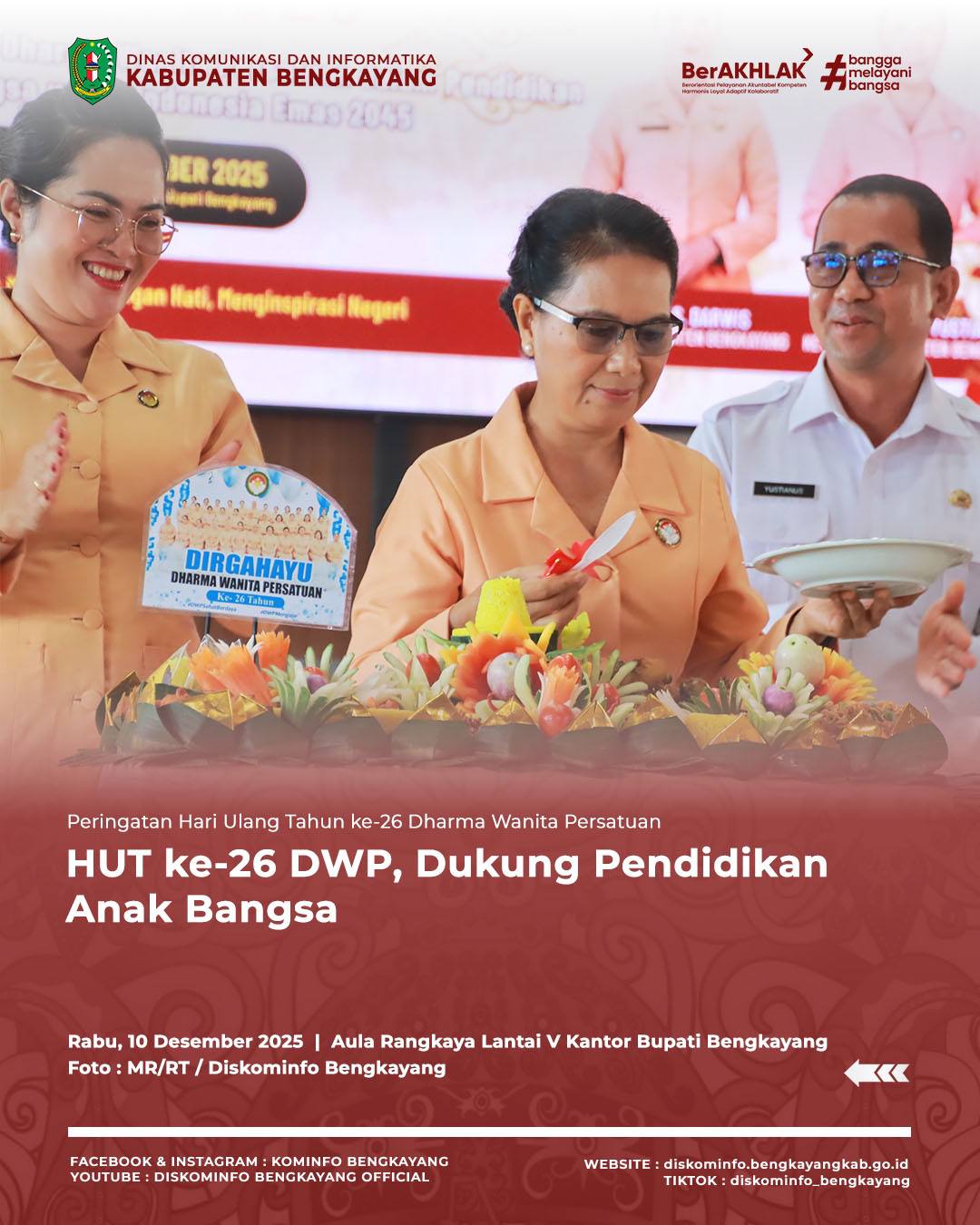 Bengkayang – Pemerintah Kabupaten Bengkayang memberikan dukungan penuh kepada Dharma Wanita Persatuan (DWP) dalam memperingati Hari Ulang Tahun ke-26 tahun 2025. Hal ini disampaikan Bupati Bengkayang, Sebastianus Darwis, S.E.,M.M., di Aula Rangkaya V Kantor Bupati, pada Rabu (10/12/2025).