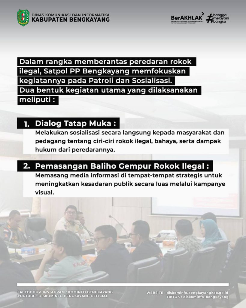 Dalam rangka memberantas peredaran rokok ilegal, Satpol PP Bengkayang memfokuskan kegiatannya pada Patroli dan Sosialisasi. Dua bentuk kegiatan utama yang dilaksanakan meliputi: