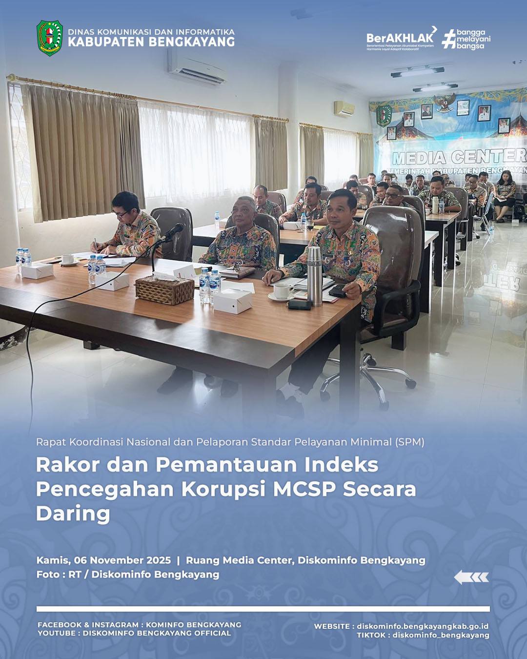 Bengkayang – Pemerintah Daerah Kabupaten Bengkayang ikuti rapat koordinasi dan pemantauan index pencegahan korupsi Monitoring Controling Surveilance For Prevention (MCSP) tahun 2025 yang diselenggarakan oleh Pemerintah Daerah se-Kalimantan Barat. Kegiatan ini dilaksanakan secara daring pada Kamis, (06/11/2025) di Ruang Media Center Dinas Komunikasi dan Informatika Kabupaten Bengkayang.