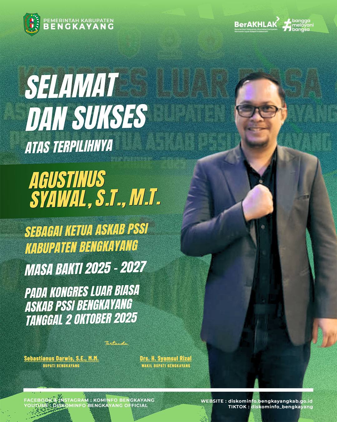 Selamat dan sukses atas terpilihnya Bapak Agustinus Syawal, S.T., M.T. sebagai Ketua ASKAB PSSI Kabupaten Bengkayang (Masa Bakti 2025-2027) pada Kongres Luar Biasa ASKAB PSSI Bengkayang pada tanggal 2 Oktober 2025.