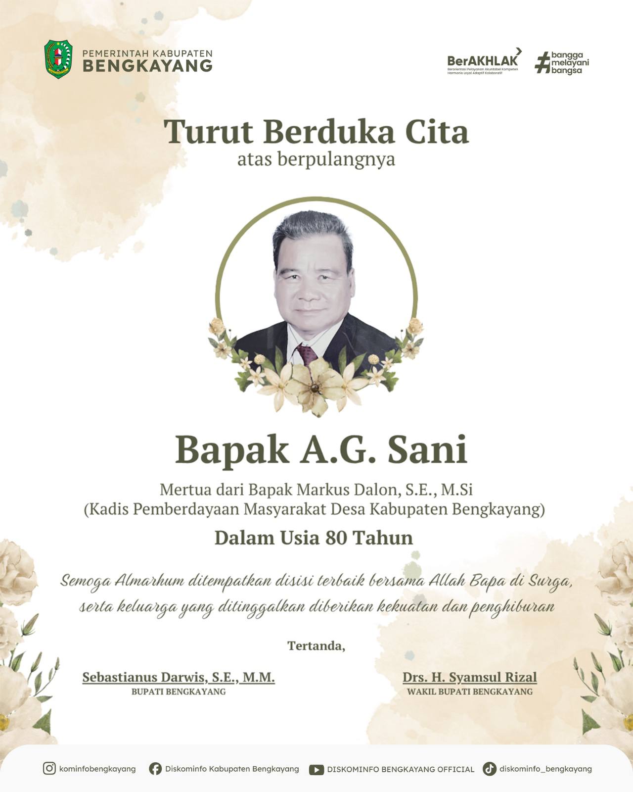 Turut berduka cita atas berpulangnya Bapak A.G. Sani, Mertua dari Bapak Markus Dalon, S.E., M.Si. (Kadis Pemberdayaan Masyarakat Desa Kabupaten Bengkayang) dalam usia 80 tahun.